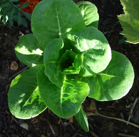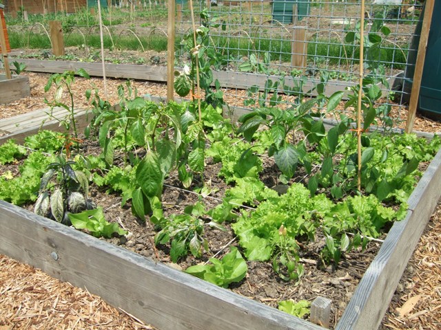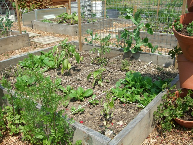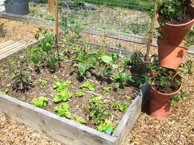 Piments, poivrons, tomates, batavias et derrière les fèves