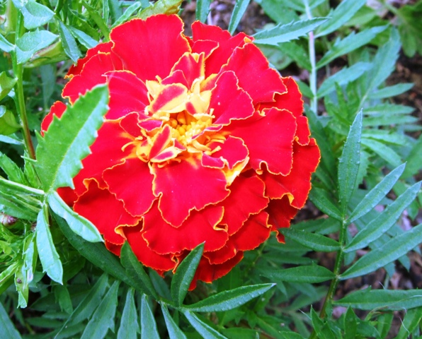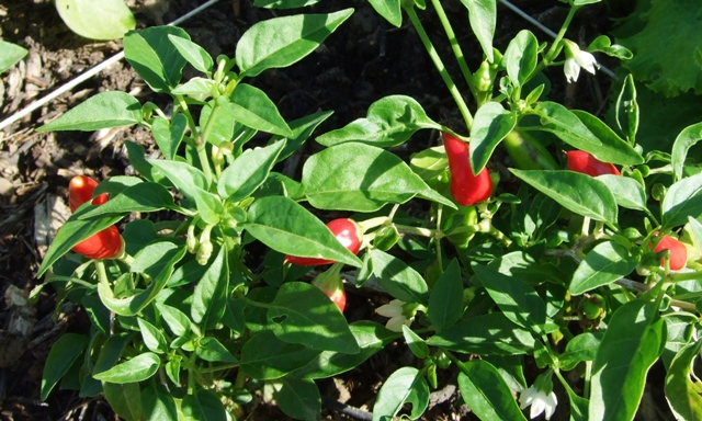 Piments, poivrons, tomates, soucis, œillets, et derrière des fèves