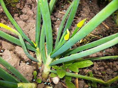 les oignons german brown laissés en terre en 2011 montent à fleur.