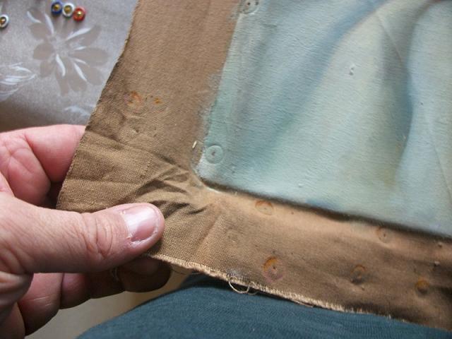 la toile a été enlevé du cadre d'origine trop abimé. De fait, je vais la retendre sur un nouveau cadre. Ce qui me surprend , le support toile de la peinture à une couleur brune? du coton brun? pas courant.Tableau fin 19ème début 20 ème. j'adore le rendu de la carnation du nue de cette peinture, et surtout le regard expressif, vert lumineux !!!