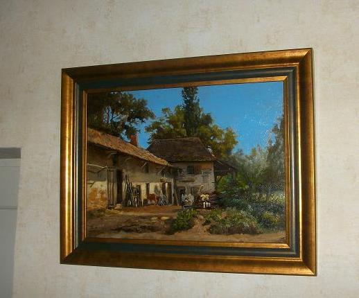 l'artiste à su rendre, du bout de son pinceau, toute l'atmosphère caniculaire d'un jour d'été! splendide , lumineux! ceci représente une ferme des environs de Pont de Beauvoisin , le toit étant typique de ce secteur.le peintre, lui même ayant vécu dans cette règion.