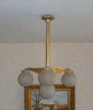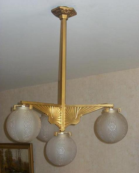 vous vous souvenez du lustre art-déco!!!! l'argenture piquée, le vert de gris du bronze apparaissait. Impossible de récupérer sans dommage l'état primitif du lustre. Refaire une argenture, m'aurait coûté les deux yeux! réflexion faites, décision fut prise de changer tous le système électrique, pour mise aux normes. Puis de poncer à coeur, le métal. Ensuite ,sur les conseils de mon aîné, peintre, passer et repasser à l'aide d'une bombe, couche par couche, de l'inox doré! résultat: en fonctionnement les 4 globes diffusent une lumière quasi solaire! parfaite luminothérapie pour les jours d'hiver. L'on croirait que le soleil se trouve dans la pièce.