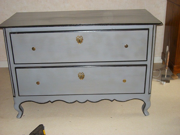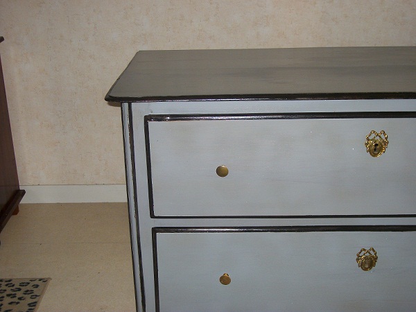 la vieille commode remise au goût du jour. pas mal comme résultat. Le reflet jaune ,en fait du vernis pailleté or, la photo ne rend pas l'aspect réel. l'utilisation d'un badigeon, spéciale poutre,lui confère un aspect pâtiné mat et veiné. Pour rendre résistant le plateau aux chocs et débords de liquide , j'ai passé un vernis de marine. Ce vernis, pour coque de bateau, résiste à l'eau de mer.