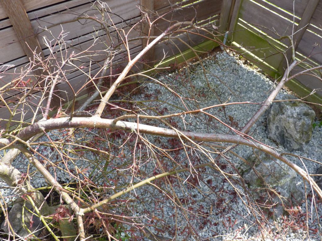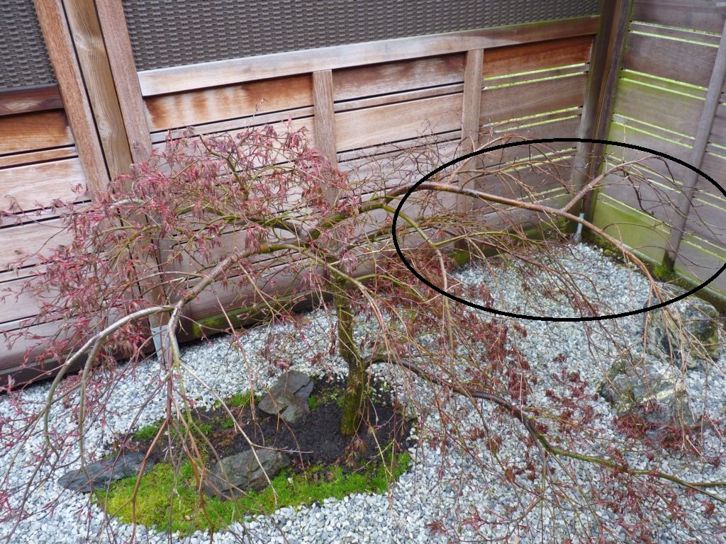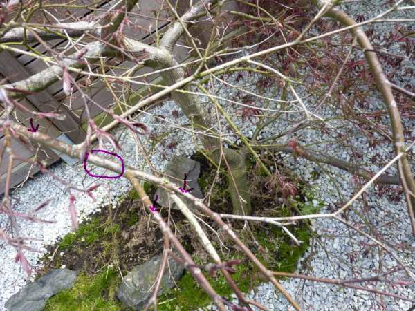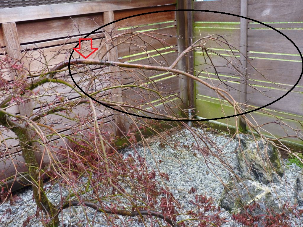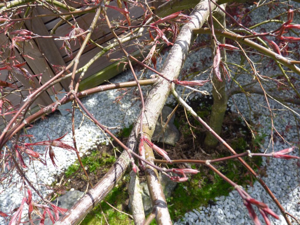 Les abandons naturels sont fréquents sur les Erables japonais. Ils se produisent le plus souvent dessous car les branches sont trop à l'ombre et sur d'autres branches par ce que la nourriture dont dispose la plante n'est pas suffisante pour tout nourrir, alors l'arbre sélectionne. Exemple: les longues branches retombantes de celui qui est en pot ont abandonné leurs terminaisons mais des bourgeons sont prêts a continuer.