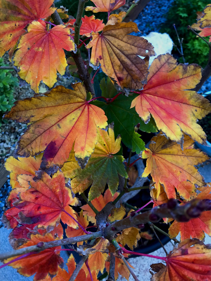 Il n'en reste qu'un avec les feuilles vertes, le petit Mikawa Yatsubusa. Sous son griottier, il amorce un changement de couleurs. À voir.