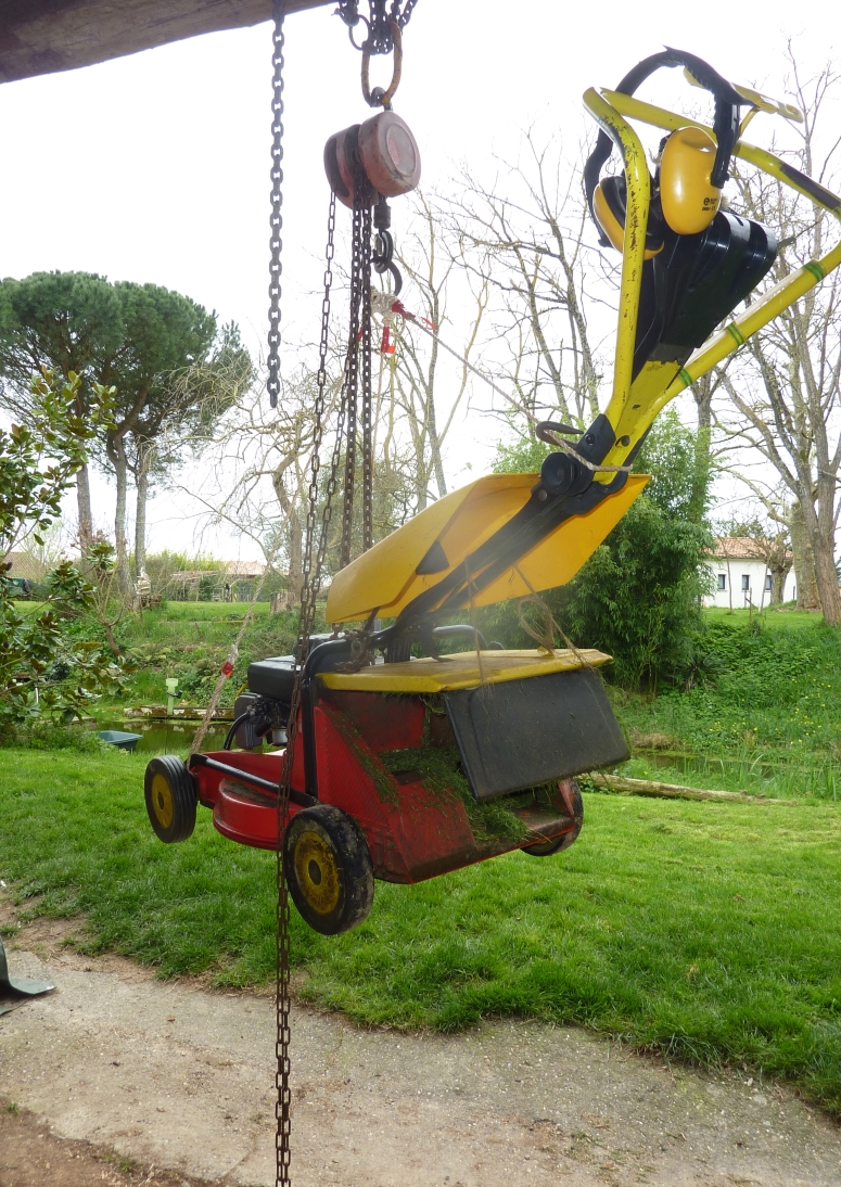 Mon genou déjà très sollicité hier n’a pas vraiment apprécié. Mais il n’aura pas à souffrir pendant le nettoyage de la machine parce que je la suspends à une poutre. Le palan à chaîne y est accroché en permanence. Photo 1.