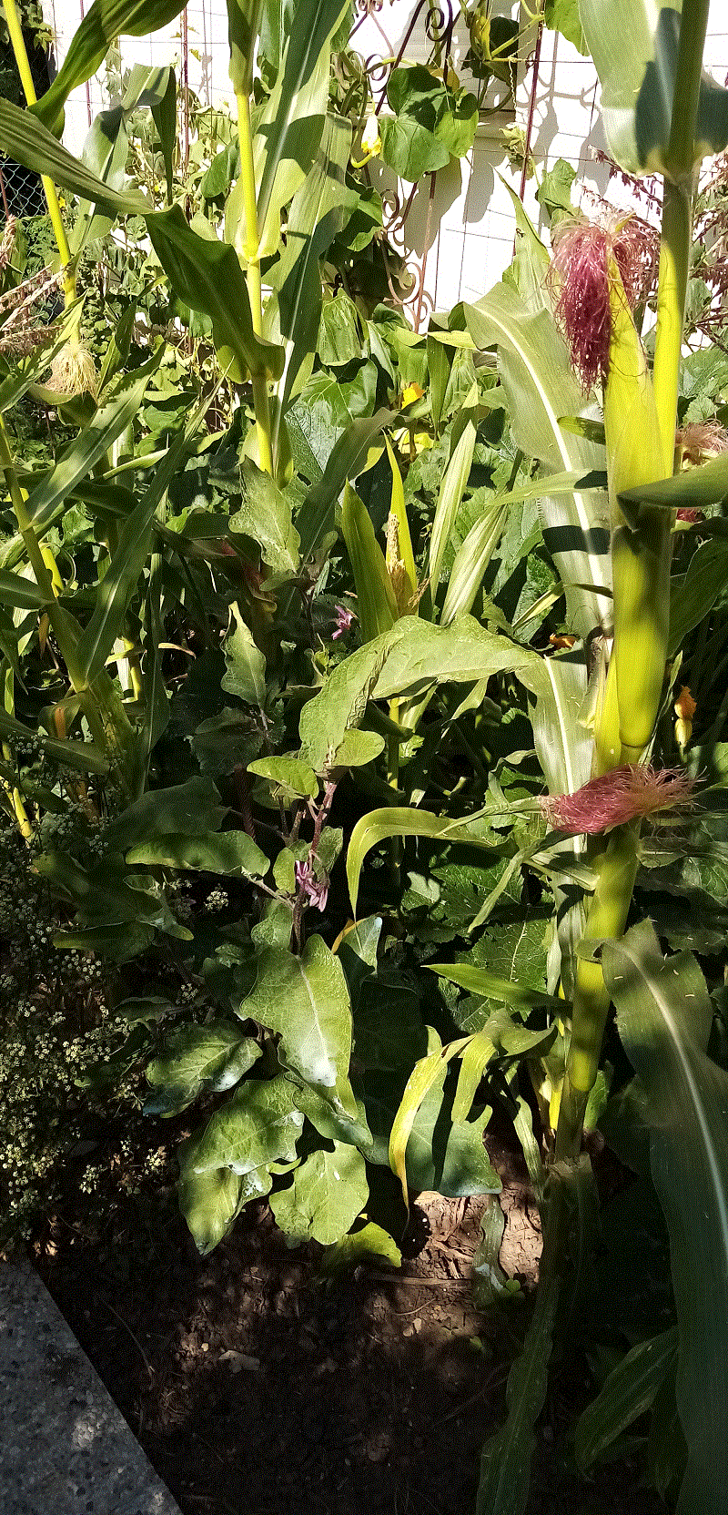 l'un de mes 4 rectangles qui est joyeux fouillis ou se trouvent concombres, potimarrons, butternuts, courgettes, betteraves rouges, poivrons, aubergines et maïs + quelques aromatiques.