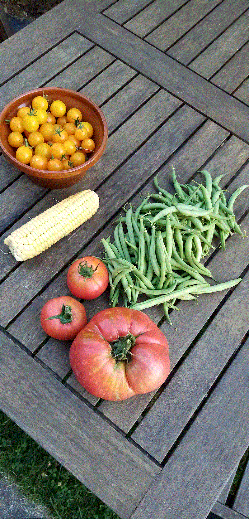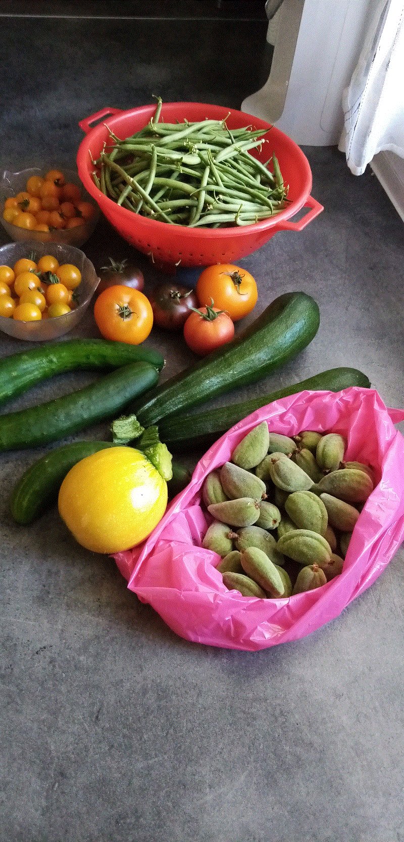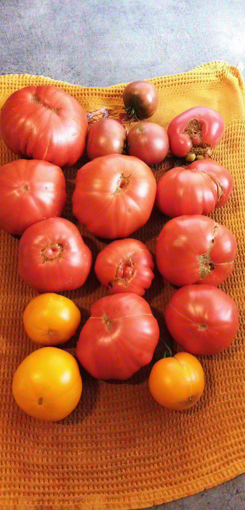 Récolte partielle du week-end, les tomates murissent rapidement, les premières sauces ne vont pas tarder.