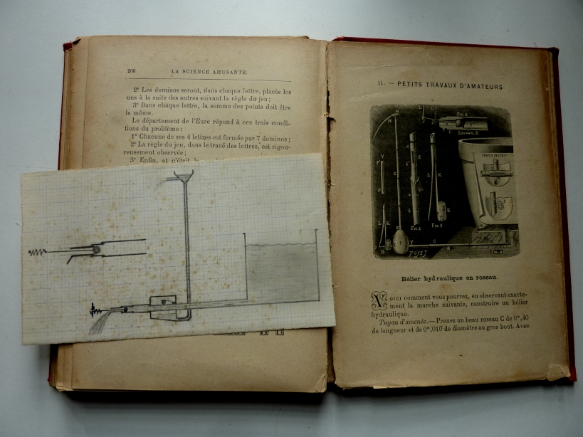 J’y ai même trouvé à la page 207 un croquis de bélier hydraulique que j’avais réalisé à l’époque, et dont le papier est maintenant en partie jauni par les champignons.