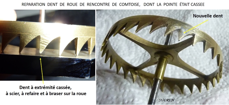 J’ai sciée cette dent, en ai fabriqué une nouvelle et l'ai rebrasée sur la roue, avec recouvrement sur la jante. Photo ci-jointe, côté droit.