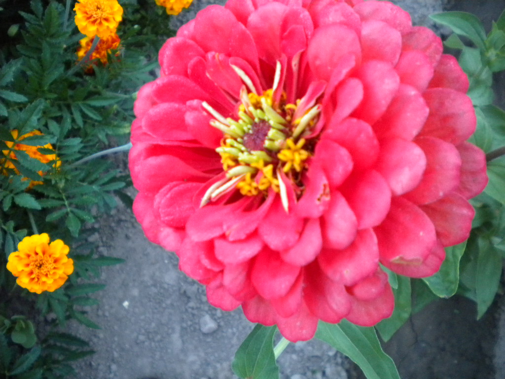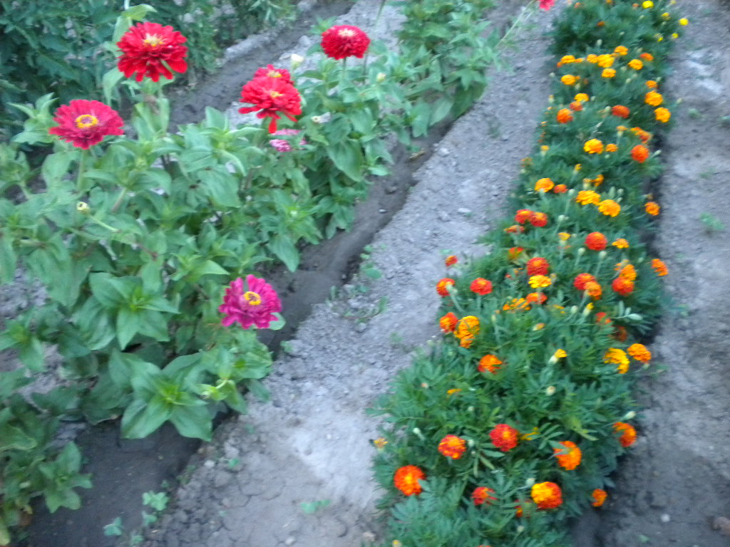 En ce moment en plein milieu du potager, j'ai un rang de zinnias et un rang d'oeillets d'Inde il faut voir ça cette merveille .Les zinnias très gros et tous de différentes couleur .