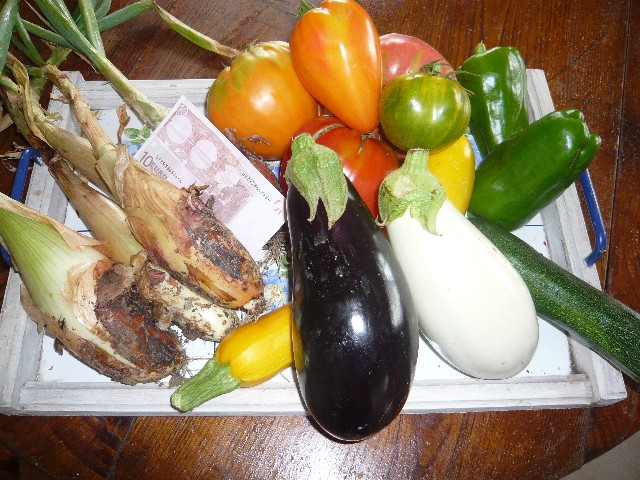 On voit, à gauche, les fameux oignons (et 1 billet de 10 € pour l'échelle), quelques tomates, aubergines (dont la Dourga ... merci Christianne :kiss: ), des poivrons et 3 courgettes (dt une jaune)