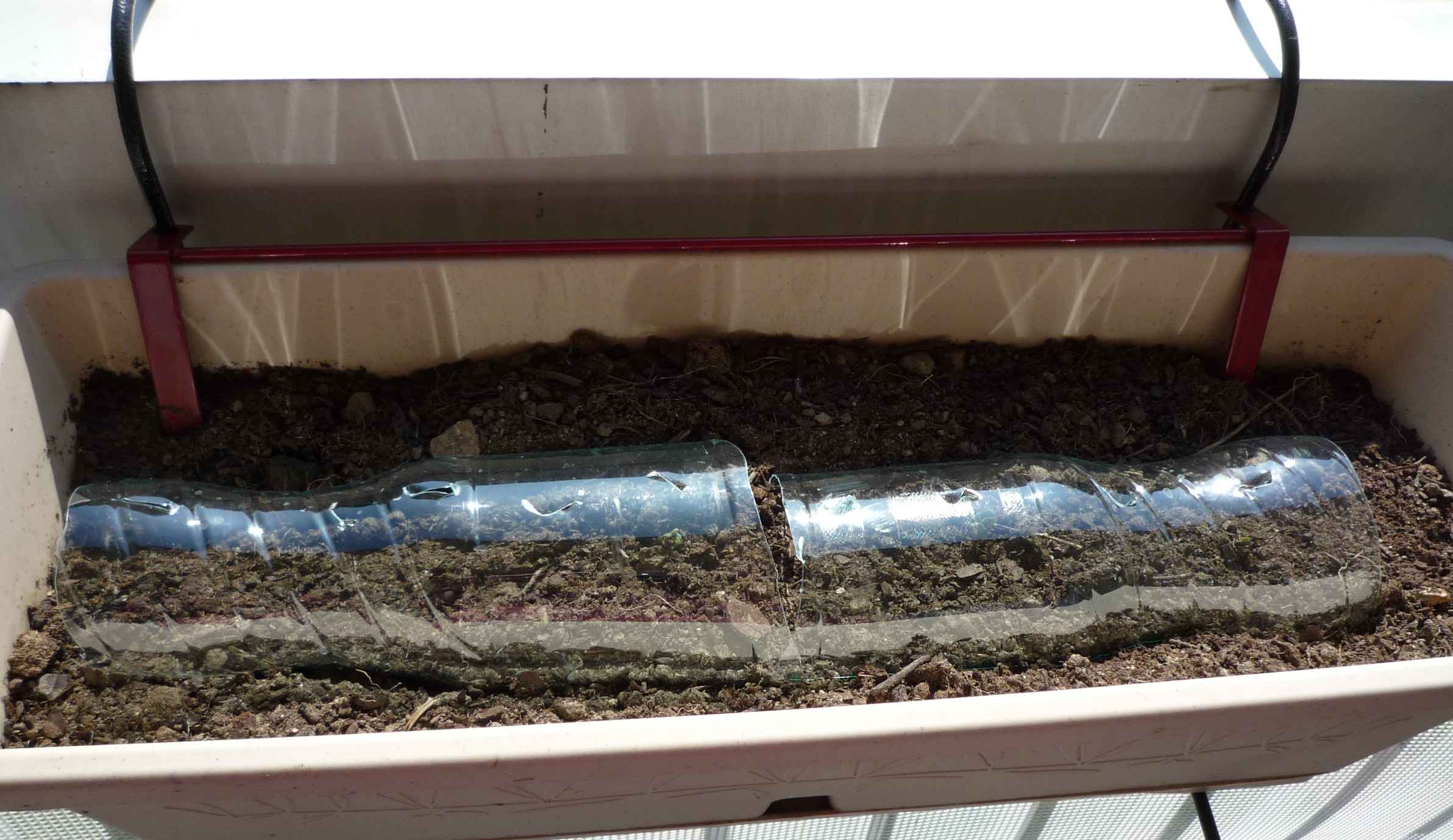 ma jardinière spéciale radis, avec une bouteille d'eau coupée en 2 en guise de protection !