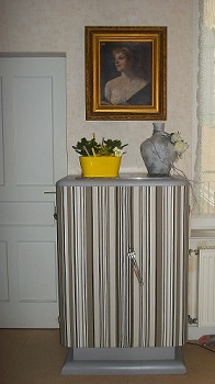 ce meuble qui était le bar: est devenu un meuble à chaussures dans l'entrée. très pratique: peinture" voile du temps" pour le bâti , et pour les portes, des rayures !!comme ma vue a baissé fortement impossible de peindre si fin. Astuce: j'ai tendu et agrafé un tissu pour bâche de pergola