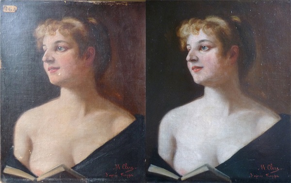 Je ne "sentais" pas le travail à accomplir. Confié à une restauratrice de renom, le résultat m'épate ! Bien m'en a pris, car la toile s'avère avoir un fond bitumeux, très en vogue fin 19ème. Ce bitume remonte sous la peinture , grisant les couleurs. La main experte de Mme Caroline Stil fit le reste.