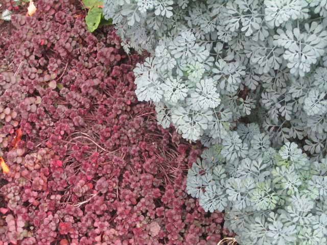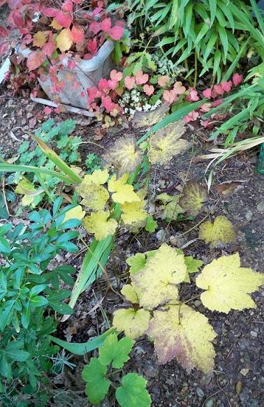 J'aime ces Dernières couleurs ! hosta, vigne vierge aux dégradés de rouge ou dorée ! sedum et rue !!.