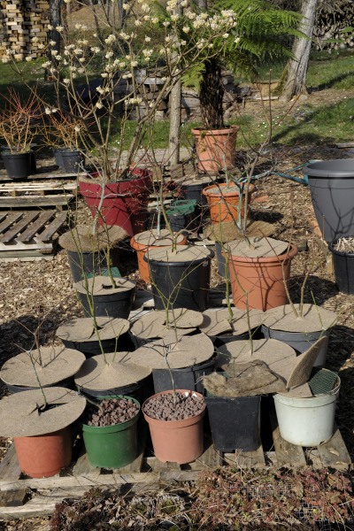 Actuellement planté dans un pot de 50x50x50, dans du mélange à 80% de terre de bruyère et 20% de terreau arbuste mélangé avec des billes d'argiles. Au fond une couche de pierres et de billes d'argiles. Grace à la météo actuelle, j'ai pu voir que le bac a l'air de bien drainé, la terre est humide sans être boueuse par contre il y a eu un peu de gel.