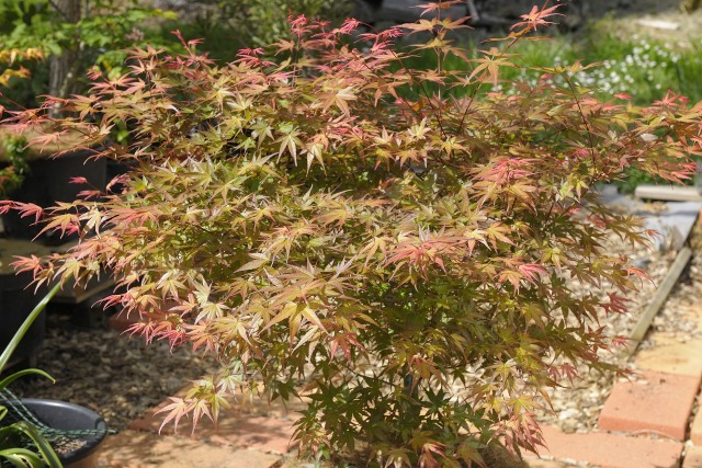 Mettre l'Acer dans un pot plus grand serait une erreur. Au contraire le cultiver dans un pot plus petit où il restera à l'étroit dans un substrat plus gros (avec écorce de Pin et pouzzolane) est la solution pour obtenir une amélioration qui prendra du temps.