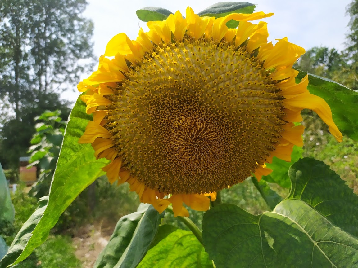 Vidéo ci-dessous (avant l'arrivée de toutes les ruches). Ce qui est intéressant, c'est que la croissance de cette variété passe du simple au double (en taille) et du simple au quadruple (en taille de fleurs) en fonction de l'exposition. Comme on le voit bien sur la vidéo, celles en plein soleil ont affiché des tailles records, tandis que celles qui étaient le plus à l'ombre ont donné des tiges frèles et des petites fleurs. J'ai même du vérifier que j'avais mis la même variété partout. C'était bien le cas!