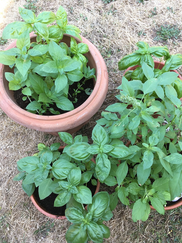 7 variétés de basilic que j'ai laissé en pots. Pas beaucoup de mi-ombre dans le potager.
