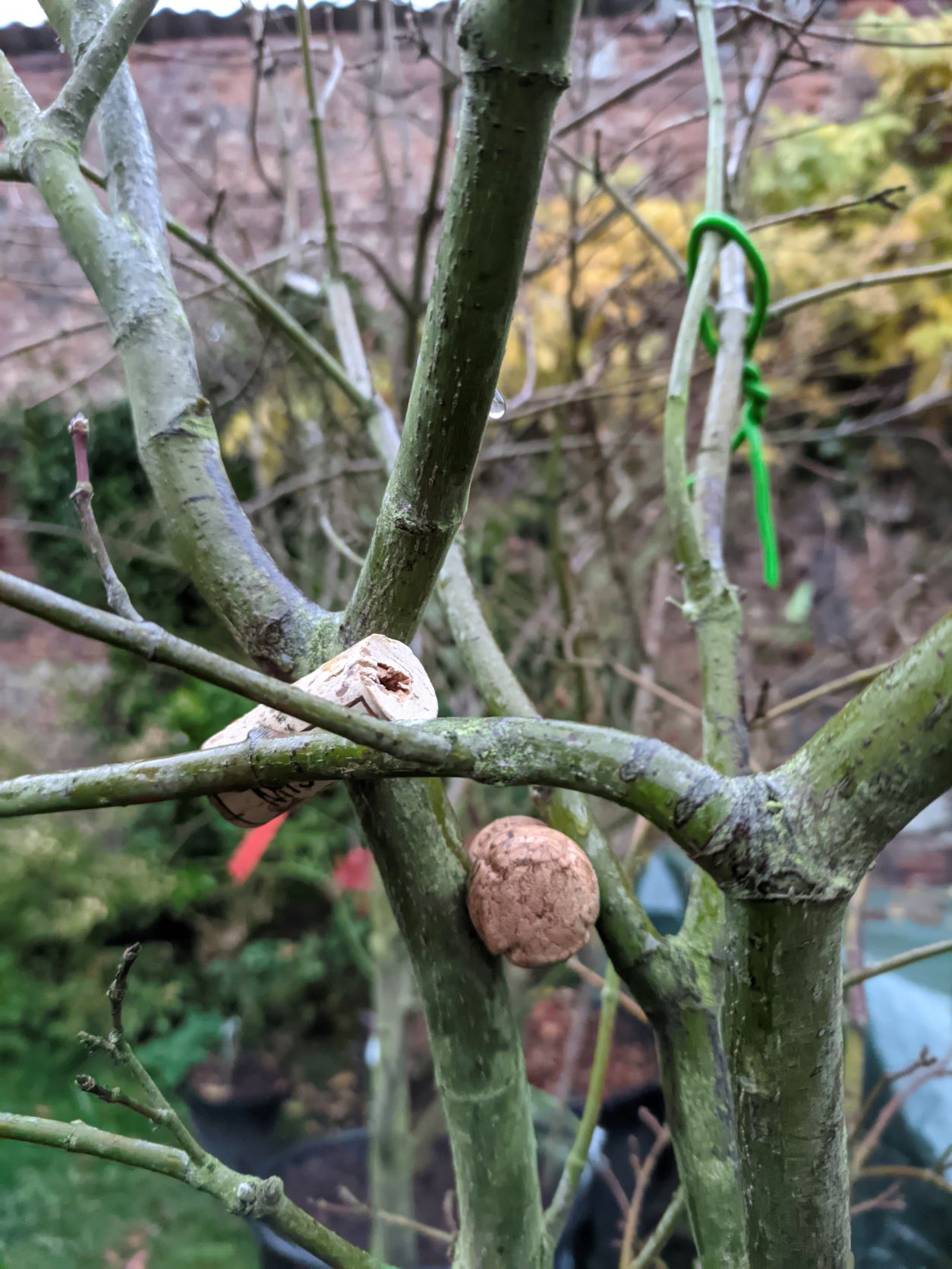 Oui, le bouchon est en place (la plante reste dehors cet hiver, livrée au vent) mais comme tu peux le remarquer sur la photo, la solution de facilité serait de tailler la branche de droite, sans que cela crée un déséquilibre dans l'architecture : la branche de gauche se ramifie un peu plus haut et comblera l'espace laissé vacant par la coupe de sa voisine. Sinon, il faudrait écarter les deux charpentières un peu plus bas, c'est encore possible. J'ai le choix...