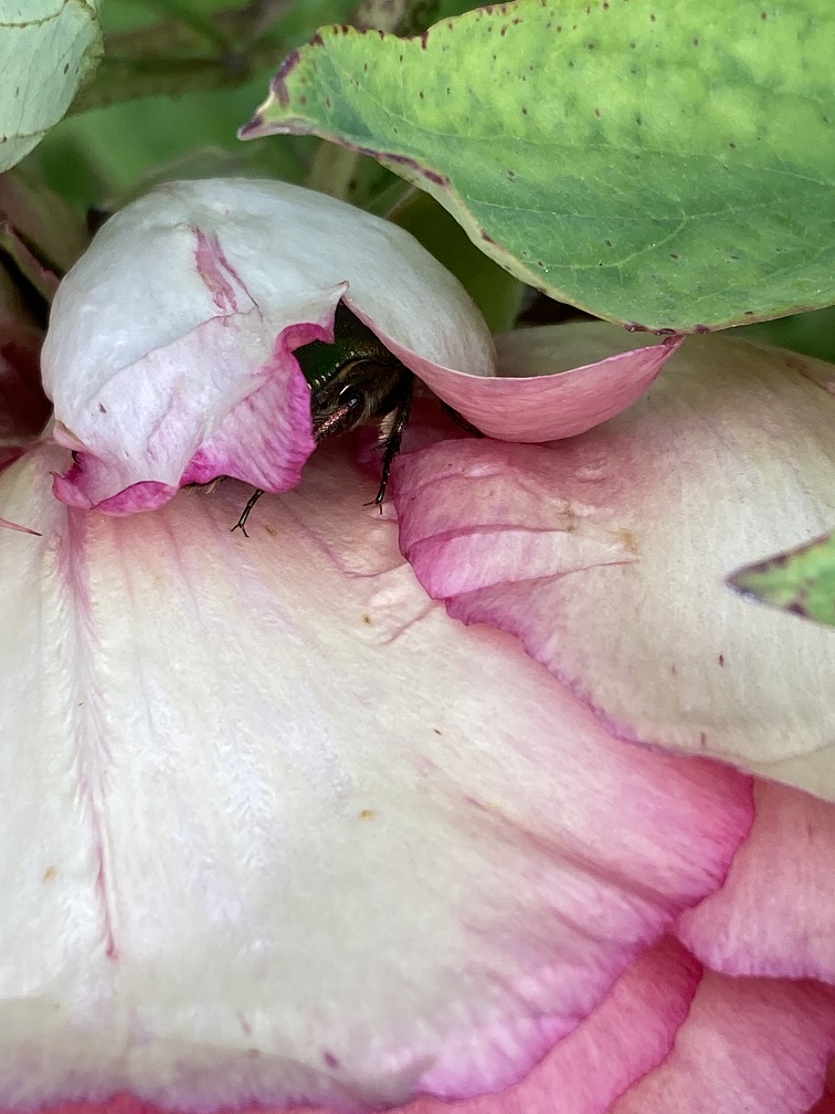 La cétoine se délecte des pétales de la pivoine, c'est sa fleur préférée, mais elle tellement belle qu'on lui pardonne facilement