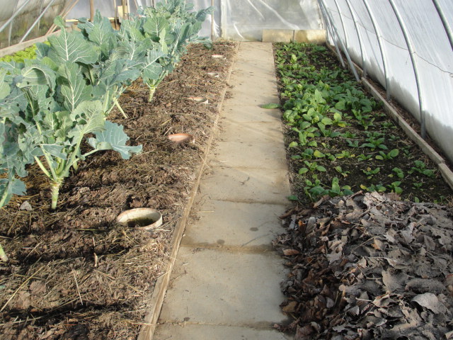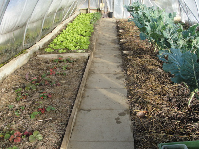 à gauche, du premier au dernier plan: plantation de 2 lignes de fraisiers de 1ère année, puis une ligne de salades asiatiques le long des salades d'hiver