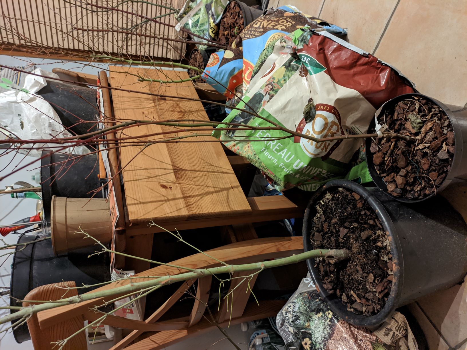 Je n'ai rentré dans le garage en sous-sol que les arbres qui avaient commencé à débourrer : deux Acer laevigatum et un Pseudocydonia sinensis : par rapport à d'autres, ma collection est modeste, une trentaine de cultivars d'Acer palmatum/amoenum et une vingtaine d'autres Acer, mais je ne me vois pas tout emmailloter avec du plastic, on verra bien.
