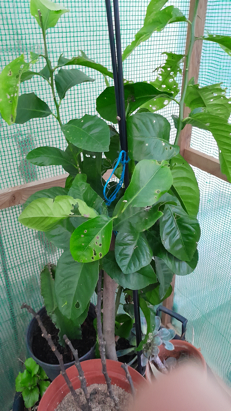Avec le retour de la douceur, j'ai retiré la housse de protection du citronnier et bonne nouvelle, il n'a pas souffert. en revanche, les escargots se sont régalés, on voit d'ailleurs l'un des coupable sur un tuteur