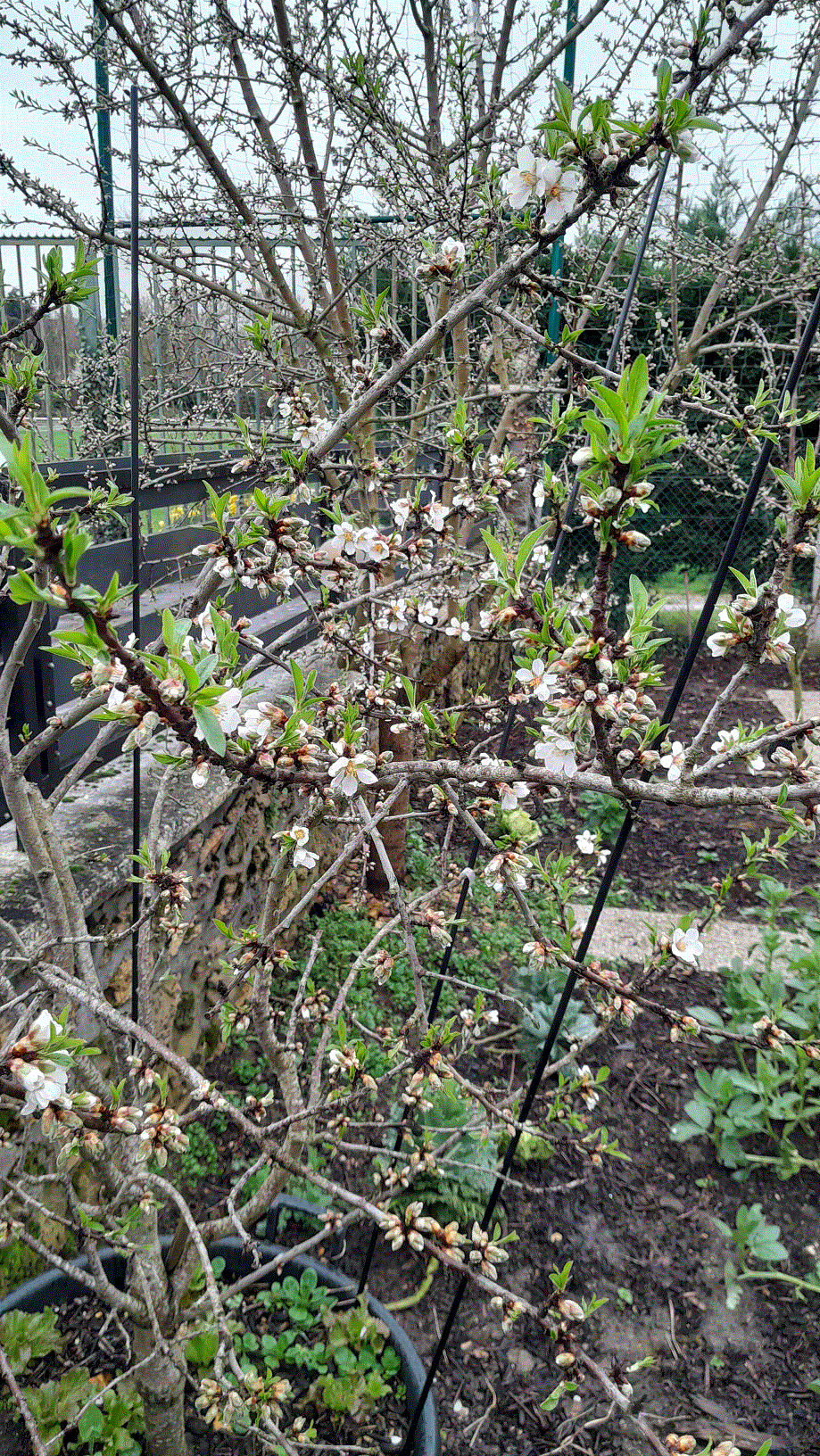 Le petit amandier est en fleurs, le plus grand derrière commence à peine.