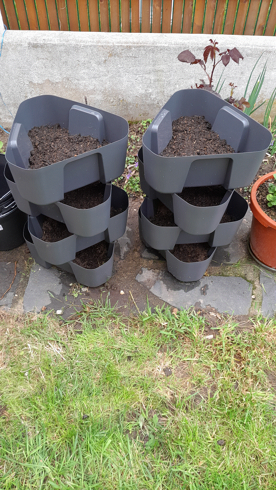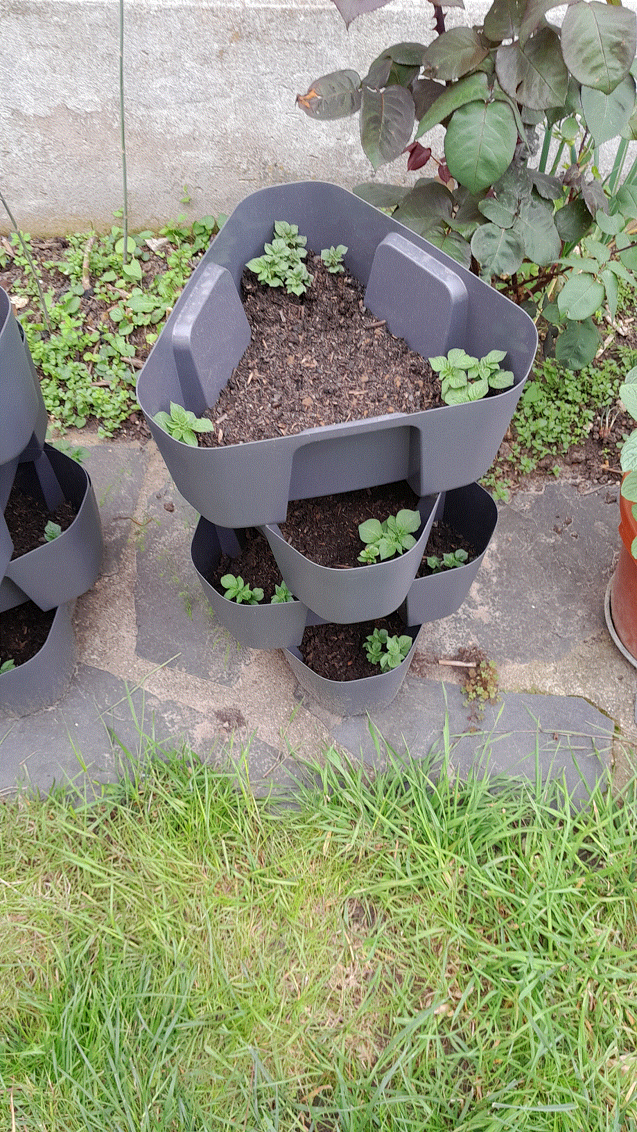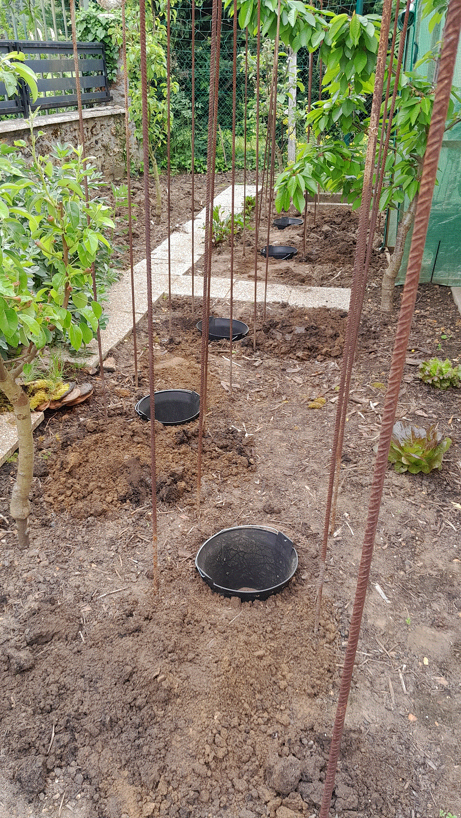 Oui ce sont des seaux dans lesquels j'ai fait trois trous à différentes hauteurs en face de chacun des quatre pieds qui entourent le seau. C'est un test...