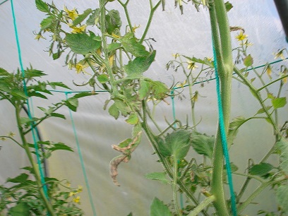 hier au soir, arrosage, on remonte les tomates qui trop lourde penchent beaucoup, on coupe les gourmands, et on re commence l arrosage,