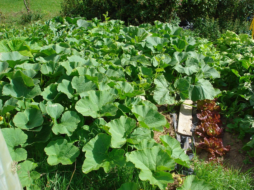 planche de courges .... cette année j'ai espacé les plants de 1m en tous sens mais ca finit en jungle quand même ... enfin ca promet de bonnes récoltes ... suite au prochain épisode