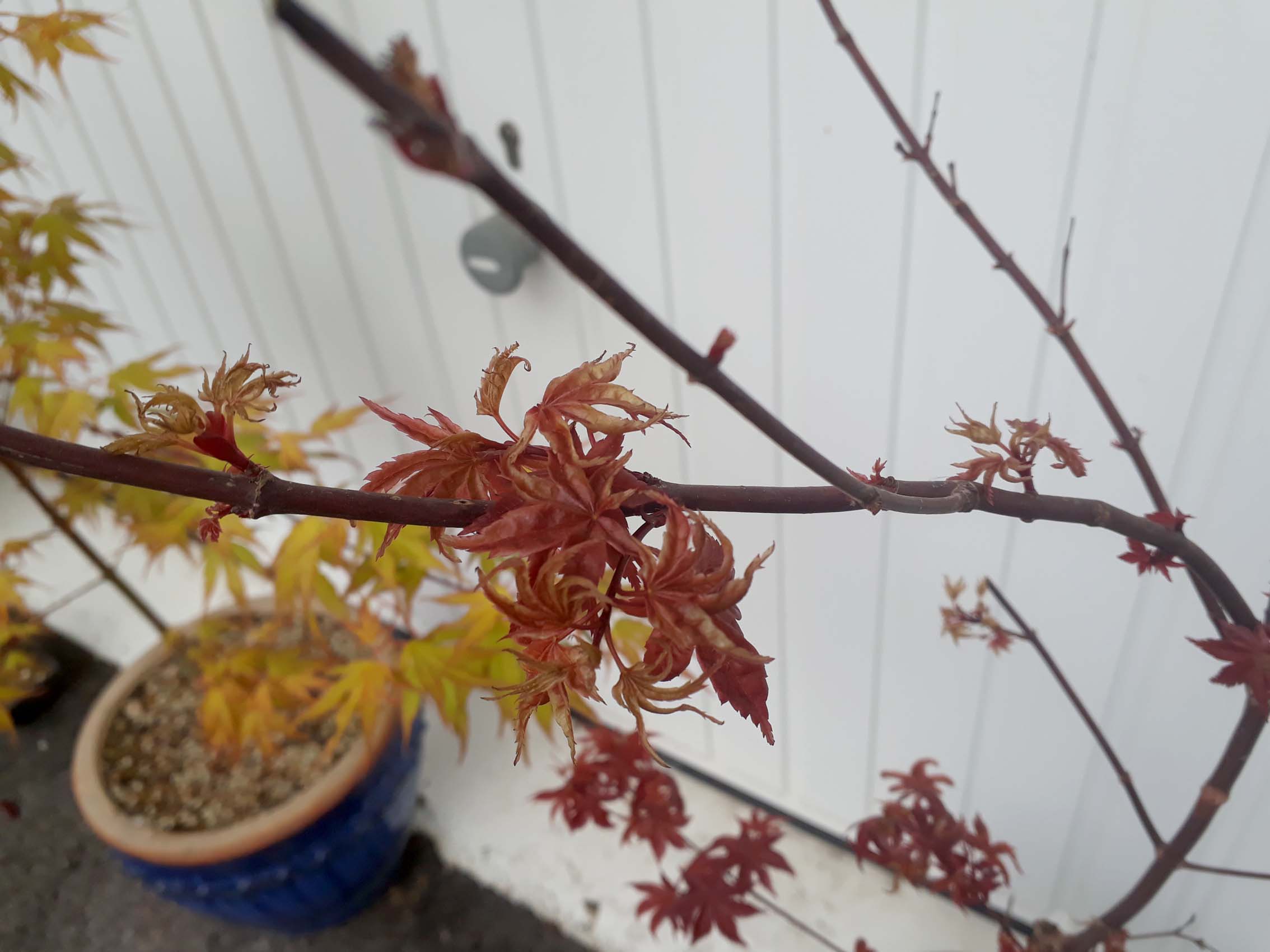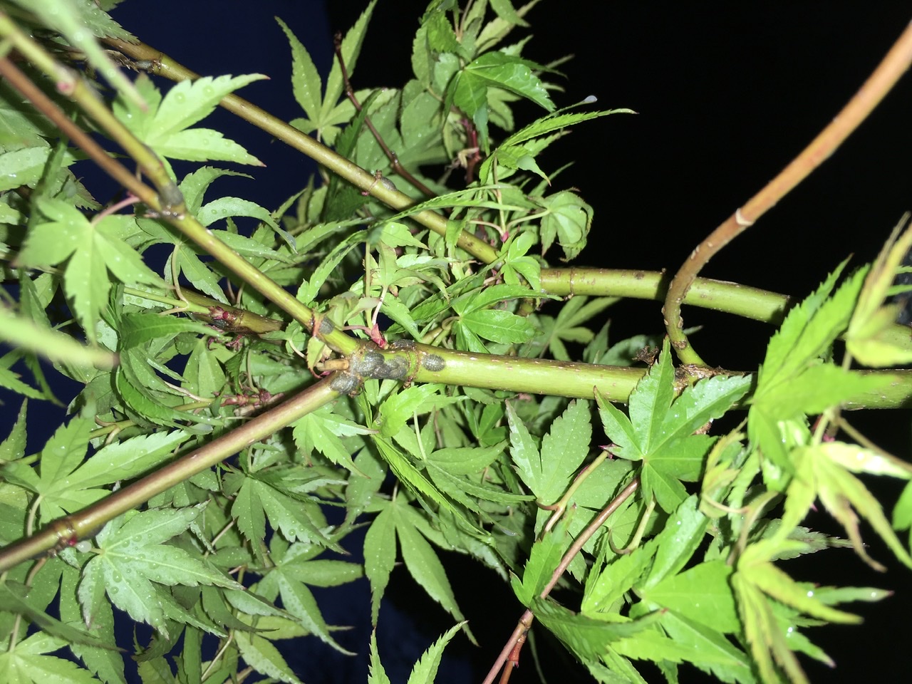 2- Tu n’as pas trouvé de traces dans la coupe d’une branche du palmatum que tu as planté, bonne nouvelle. J’aurais aimé le voir en entier avant de commenter la branche à moitié noire, les autres paraissent bien vertes. C’est très encourageant.