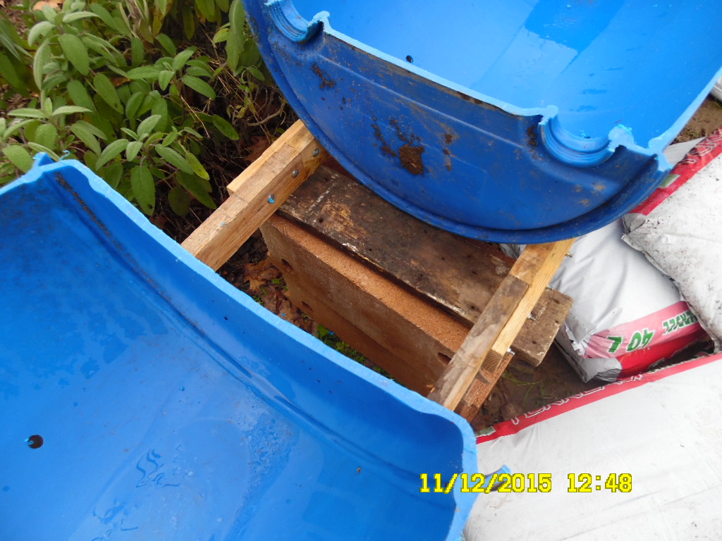 dessus je pose les bidons coupes, a cheval sur les chevrons, que je vais remplir , mais avant je mets de l eau pour faire la hauteur d eau de reserve et je perce juste au dessus du niveau