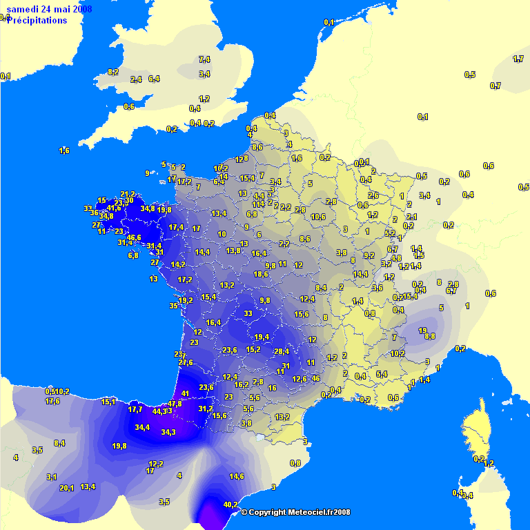 !! 32mm de pluie depuis la fin de nuit! pas d'orages, mais des averses fortes et fréquentes! ...et vent plutôt faible, mais plein ouest!