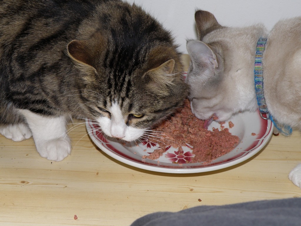 C'est beau de voir des chats manger ensemble.