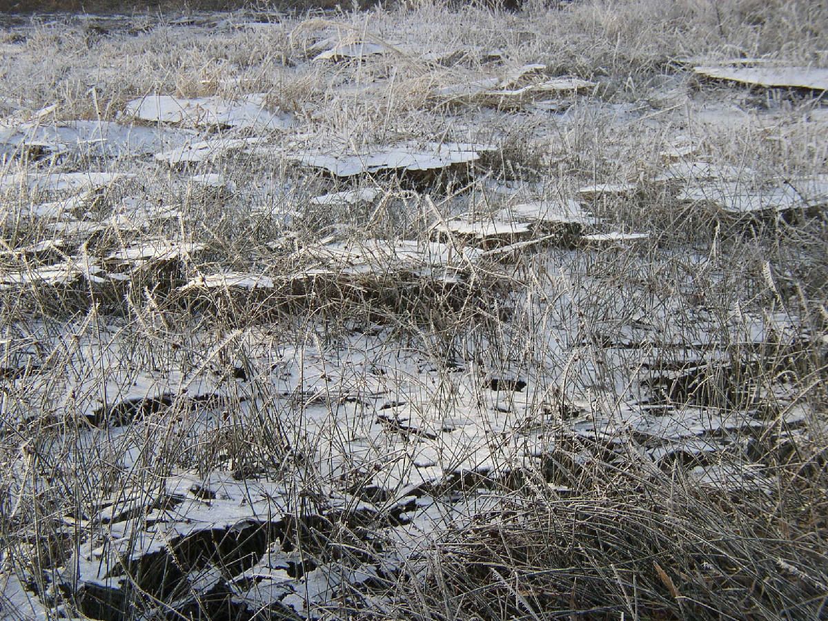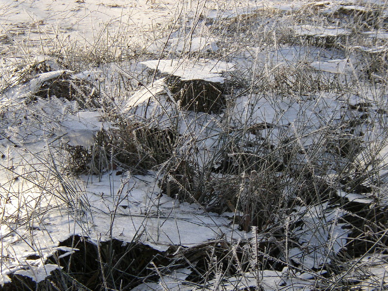 L'eau étant évacuée, il reste ces plaques de glace de surface, suspendues aux herbes.