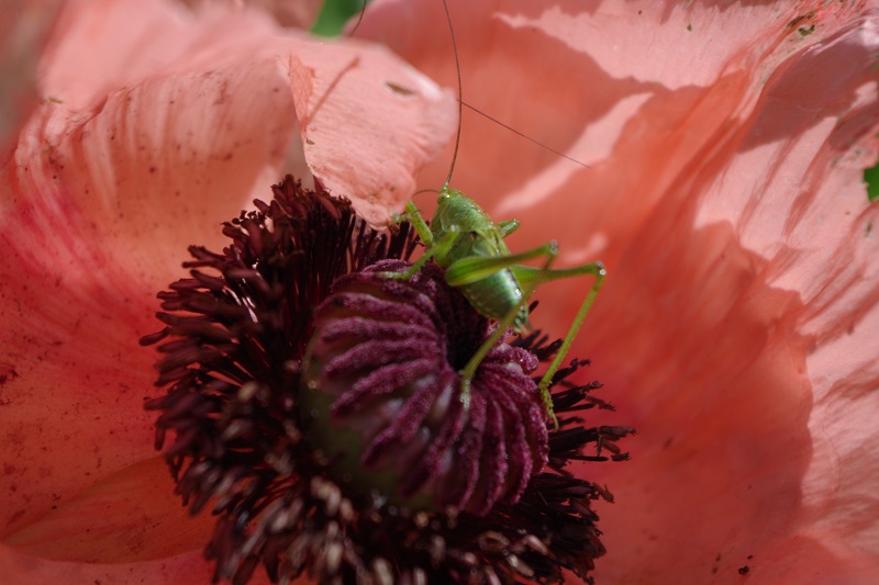 Sauterelle sur une fleur de pavot . J'ai beaucoup de sauterelles dans le jardin , les chats les chassent et les mangent .