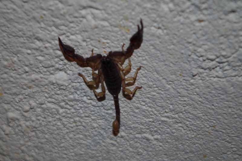 Petit scorpion sur le mur de la cuisine . Il y en a pas mal par ici mais ils sont petits . Il parait que ça donne la fièvre quand ils piquent .