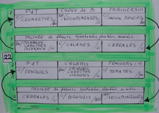 Le plan permet de lire les productions saisonnières et les transitions. Celles-ci sont sous forme d'abréviations et suivant leur position elles indiquent la couverture hivernale (précédente si elles sont à gauche, suivante si elles sont à droite).