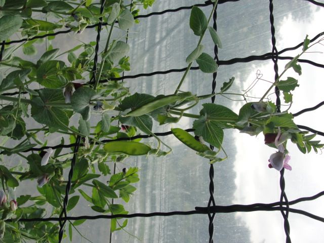 Depuis une semaine les pois mangetout partent à l'assaut du treillage et moi, tous les matins, je pars à la chasse aux petits pois.