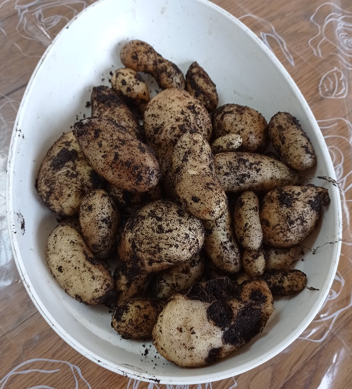 Au fond de mon jardin à Clermont j’ai un grand bac en bois sans couvercle dans lequel je mets tout ce que je ne peux pas mettre dans le composteur : végétaux trop ligneux, mauvaises herbes montées à graines, contenus de pots et jardinières …. J’y ai sans doute jeté aussi des pommes de terre inutilisables, en tout cas j’avais repéré en début d’automne un beau pied de pomme de terre en pleine végétation, dès que le feuillage a été détruit par le premier coup de gel j’ai eu la curiosité de voir s’il y avait quelques tubercules, et là belle surprise ! 1kg de belles pommes de terre nouvelles.