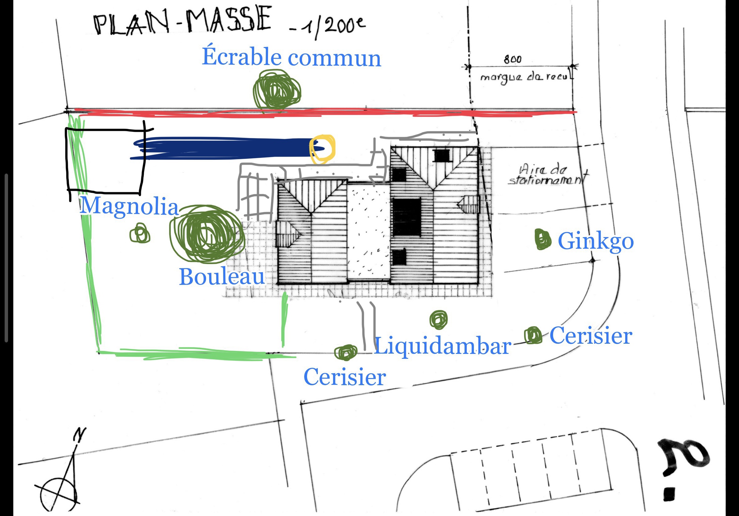 Vous avez l’orientation indiquée en bas à gauche. Le trait rouge est un mur en brique de 2m de haut, les traits verts clairs sont des haies de persistants. La zone bleue foncée est la zone de drainage des eaux de pluies, pas sure de pouvoir y planter un arbre.