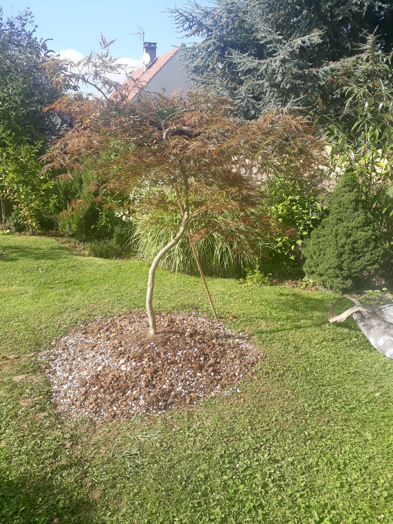Les érables du Japon n’ont pas de racines puissantes qui pourraient causer des dommages à la maison, aucun souci de ce côté là. Juste prévoir de la place concernant son diamètre une fois adulte pour qu’il ne frotte pas les branches contre les murs.