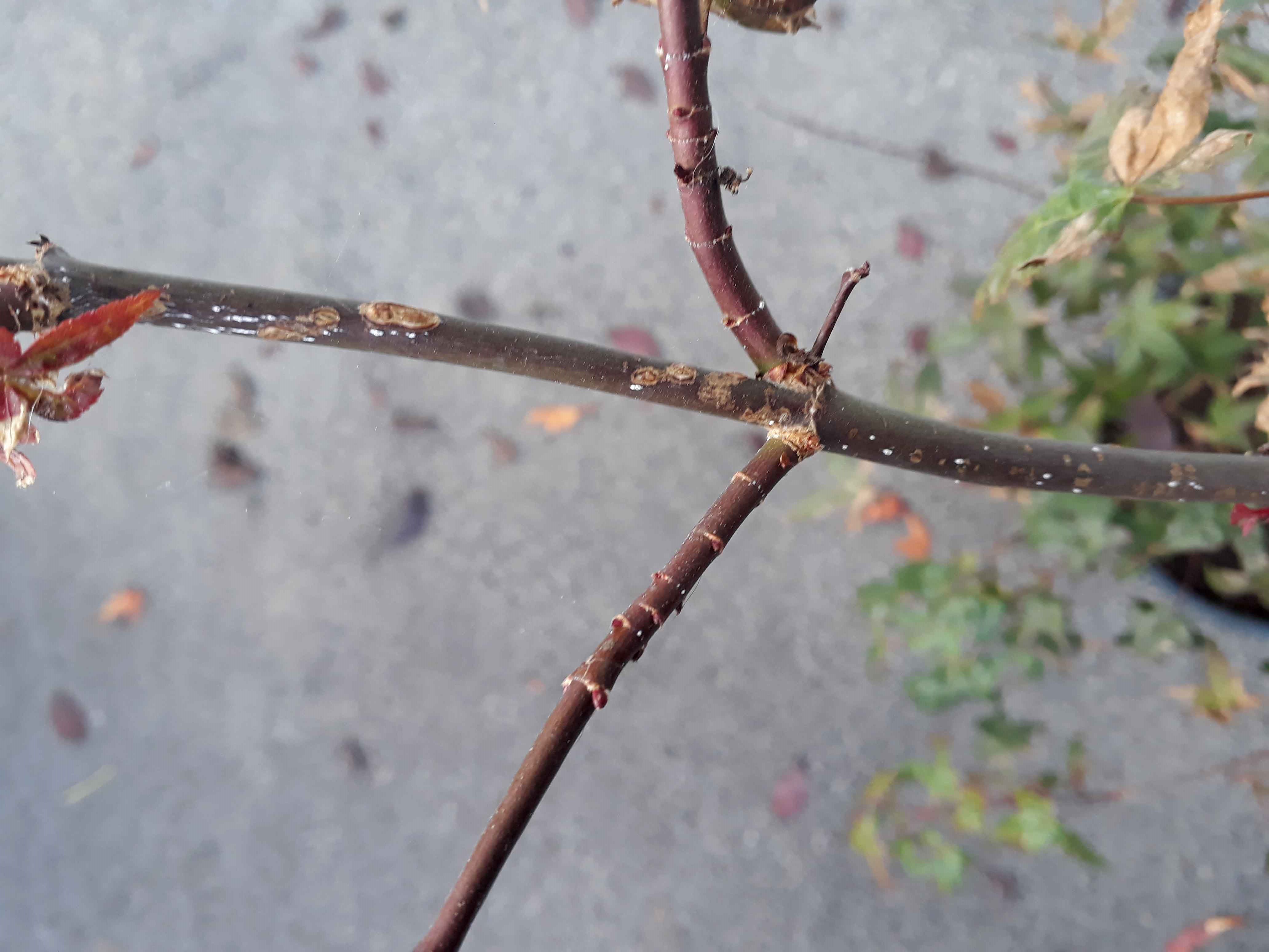 J’ai remarqué des petits points noir sur les samares et une matière collante et brillante sur les feuilles de l’ozakazuki. Qu’est ce que ça peut bien être ?