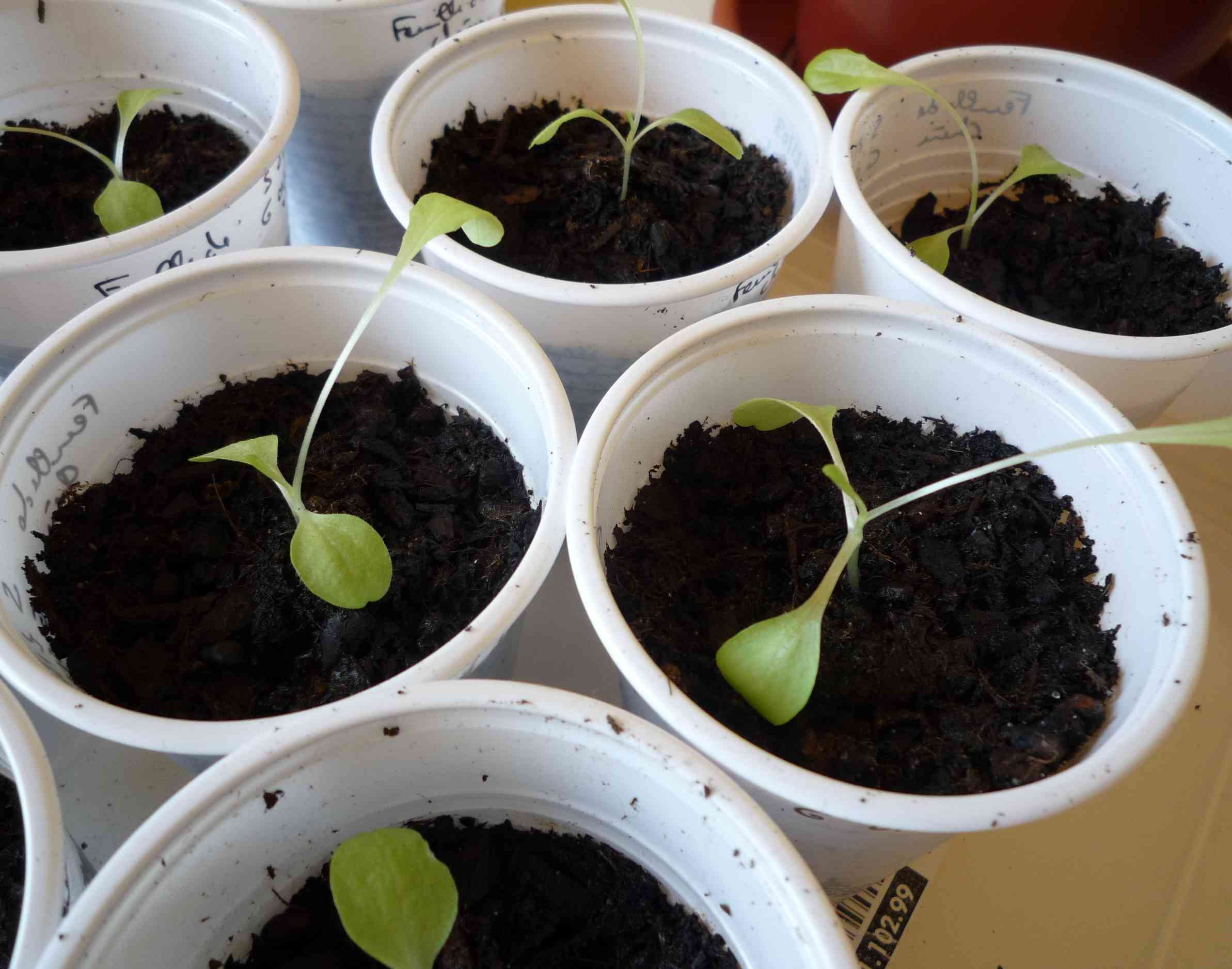 ce soir, j'ai mis mes petites salades dans des gobelets, elles étaient faiblardes (vert très clair) et heureusement que j'ai fait, car les racines avaient atteints le carton de la boite à oeufs et même elles s'y sont insérées