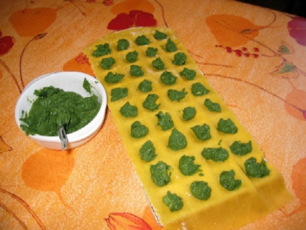 Lors de l'émission culinaire ils ont fait des raviolis ainsi. Étendre la pâte et la poser sur la table, la badigeonner de blanc d'œuf (les jaunes ont servis à la confection de la pâte) déposer la garniture en tas, remettre par dessus une pâte et ensuite ils ont soudés et surtout n'ont pas laissé d'air,et couper soit au couteau ou avec la roulette" coupe pâte". si tu vois ce que je veux dire....