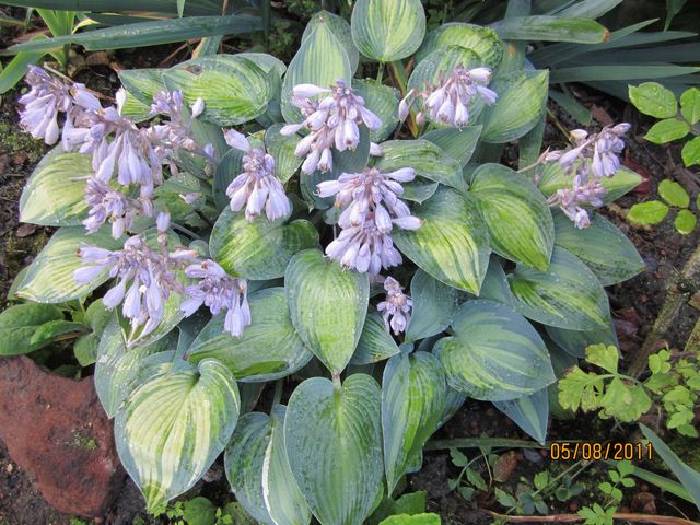 Hydrangea + hosta : on peut distinguer encore les stigmates du violent orage de grêles subit en juin :