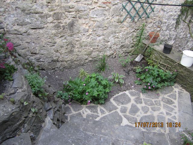 avant vus de haut après vus autrement avec pierres rejointoyées ce fichu fond avant et actuellement gros chantier d'automne prévu !! et cela aussi Je sais que les bordures ont été mises à l'envers mais comme la personne qui a passé du temps et y a mis tout son coeur il a été dit qu'elles resteraient ainsi !! hihihi et voila encore des géraniums qui vont aller au fond dans l'angle du mur et muret !